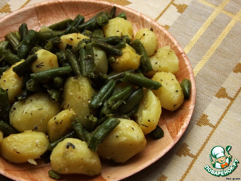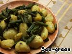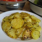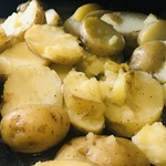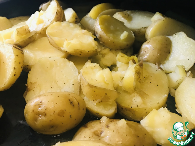 Сначала берем молодой картофель средней величины, хорошо его моем, можно снять кожуру, но я ее не снимаю. Наливаем в кастрюлю воды и ставим вариться картофель. В конце солим. Тем временем, пока варится картофель, делаем соус: наливаем в посудину оливковое масло, добавляем по одной чайной ложке разных сушеных травок, хорошо все перемешиваем и выливаем всю эту массу на горячую сковороду, туда же отправляем сваренный нами картофель и обжариваем до золистой корочки.