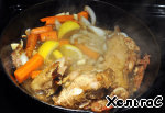Уже обжаренные куски курицы складываем в большую кастрюлю и добавляем чернослив, нарезанный киви и обжаренные морковь и лук. Веточка мяты придаст неповторимый аромат. И если при тушении увидите, что сока, выделенного фруктами, недостаточно, то подлейте любого цитрусового немного. Да, и по поводу чернослива: если он уже достаточно мягкий, то добавьте его в последний момент за 15 мин. до готовности.