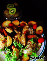 Тушим минут 30 до готовности на маленьком огне. Все выкладываем на блюдо и украшаем зеленью, поджаренными лаймом, картошкой и помидорами черри. Запах... не передать. Оставшиеся разваренные овощи -фрукты взбиваем и полученным соусом поливаем курицу и картошку. Я соус сделала после фотосессии... поэтому его нет на картинках, поверьте, очень вкусно.
