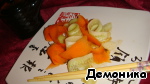Очистить морковь и огурец. Овощечисткой или специальной тёркой нарезать тонкими лентами. Щедро побрызгать заправкой, аккуратно перемешать пальцами, красиво уложить на тарелку и сразу подать. Естественно, не солить.