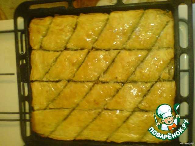 Последний слой теста смазать яйцом и порезать весь пласт на ромбы.