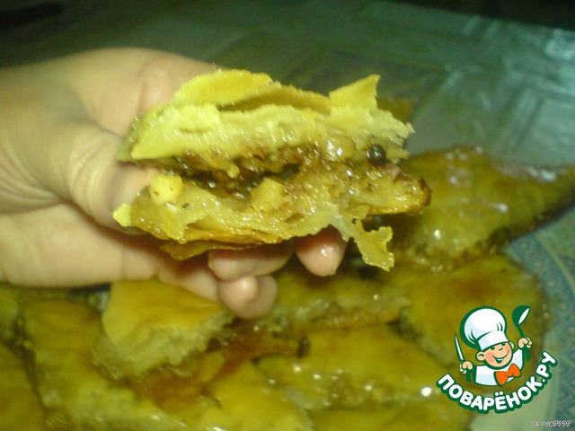 Замесить тесто и дать отдохнуть ему минут 20-30. Пока оно отдыхает, сварить сироп в течение 10 мин. Взять кусочек теста с маленький детский кулачок, раскатать диаметром, примерно, 25 см и начать растягивать тесто руками. Вытягивать можно на весу и на столе. Как тесто фило, т. е. почти прозрачное, его не надо вытягивать, поскольку замесили очень мягким и оно быстро рвётся, но всё же близко к этому.