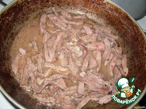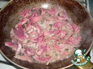 Мясо режем на мелкие полосочки и выкладываем на раскалённую сковороду (предварительно налить растительного масла). Обжариваем на большом огне около 10 минут.