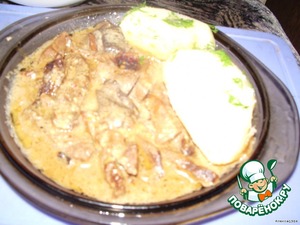 Мяско очень нежное и вкусное, со сливками и грибами.
