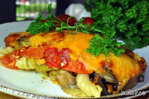 Или положить все слоями - рожки, баклажаны, цуккини, помидоры, а сверху сыр и все запечь