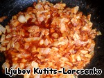Когда фасоль будет почти готова, слегка поджарить в 40 г жира 50 г муки, добавить к ней нарезанный лук, жарить еще 1 минуту;