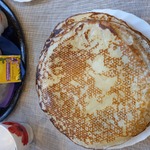 7. Переворачивать удобнее лопаточкой, лучше силиконовой. И, если обычные блины часто переворачивают когда сверху не остаётся жидкого теста, то эти лучше немного дольше подержать на первой стороне, так если не додержать, то сложно перевернуть, могут рваться. Ушла жидкость, ещё немного подождали и переворачиваем.