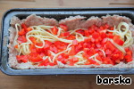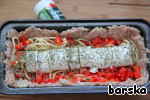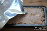 Покрыть тонким слоем фарша и закрыть фольгой (крышкой для террина). Запекать в духовке 30 минут при 180* С.