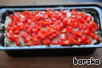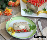Вынуть форму, слить образовавшуюся жидкость, снять фольгу. Посыпать террин сверху кубиками паприки. Запекать ещё 15 мин. в открытом состоянии.