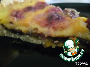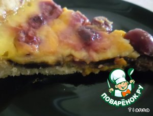 Достать корж из духовки. Смазать его шоколадным кремом и выложить вишни. Я использовала "Крем-десерт а-ля Данетто для микроволновки" https://www.povarenok.ru/recipes/show/46645/ Спасибо Ларисе за рецепт.
