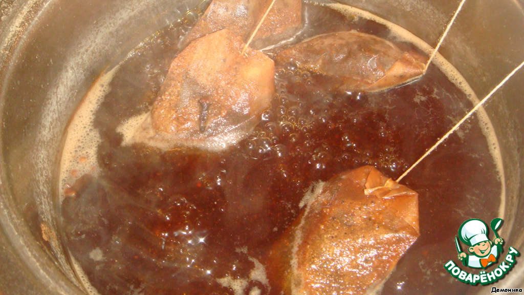 В маленькой кастрюльке вскипятить 2 стакана воды, положить пакетики чая, добавить соевый соус и пряности. Я добавила щепотку мускатного ореха, штук 5 гвоздичек и щепотку имбиря.