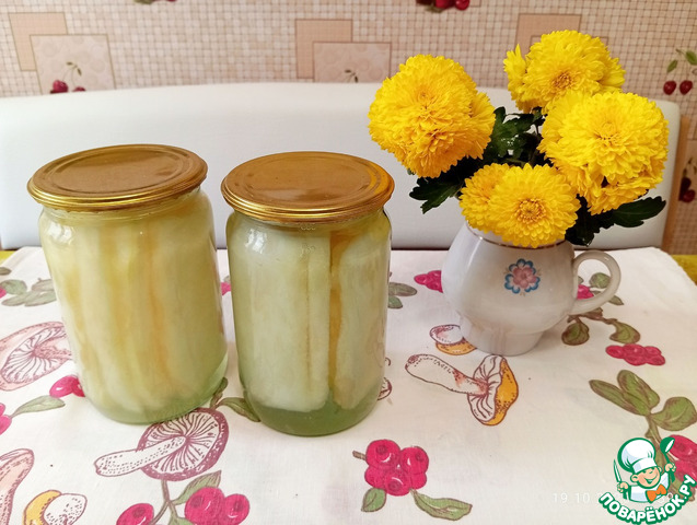 Дыни сложить в банки по 1 л, залить горячим сиропом и накрыть крышками.