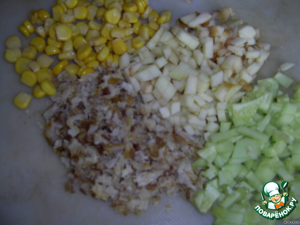 Яблоко нарезать кубиками, огурец нарезать кубиками, минтай нарезать мелко, кукурузу промыть в холодной воде и обсушить.