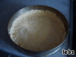 Выкладываем наш шарик в форму и прокалываем вилкой корж для того, чтобы он не деформировался при выпечке. Можно положить на пекарской бумаге фасоль или горох, но мне всегда жаль эти продукты переводить понапрасну.