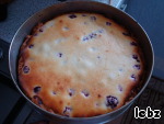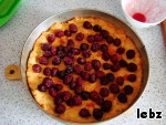 Достаем готовый корж и на горячий, сразу, выкладываем ягоды.