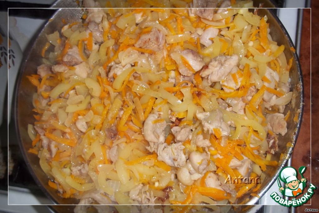 Тем временем, нарезаем небольшими кусочками мясо. Обжариваем его на медленном огне до готовности.