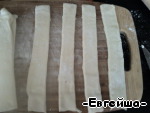 Необходимо разрезать тесто на одинаковые полоски. Полосок должно быть равно количеству половинок мармелада. У меня в этот раз получилось 8 штук.