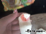 Берём половинку мармелада и начинаем закручивать его в полоску, но не в одну сторону, а как бы по часовой стрелке, переворачивая получающийся шарик. В общем, нужно чтобы мармелад при выпекании не вытек. Я даже прижимаю краешки теста при перекручивании.