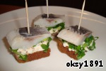 Канапе на ржаном хлебе с яичным дипом и сельдью.