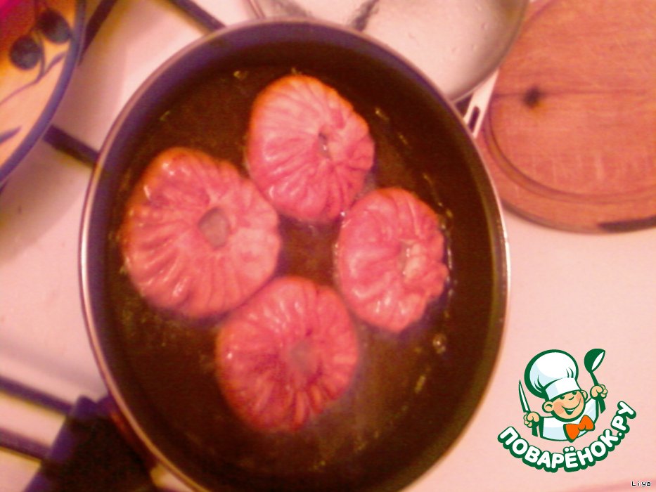 7. В сковороду налить подсолнечное масло примерно 2-3см. в высоту. Начинаем жарить, кладем их дырочкой вниз чтобы мясо прожарилось! Периодически поднимаем вилкой или ножом, чем удобно, чтобы наши беляшики не подгорели.