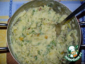 Пока тесто подходит, готовим начинку. Картофель почистить и отварить. Горячим размять в пюре. Луковицу мелко нарезать и обжарить в половине масла. Добавить в пюре, затем добавить мелко нарезанный укроп, растопленое оставшееся масло (растапливаю в микроволновке), соль и перец по вкусу. Перемешать. Очень ароматная начинка получается!