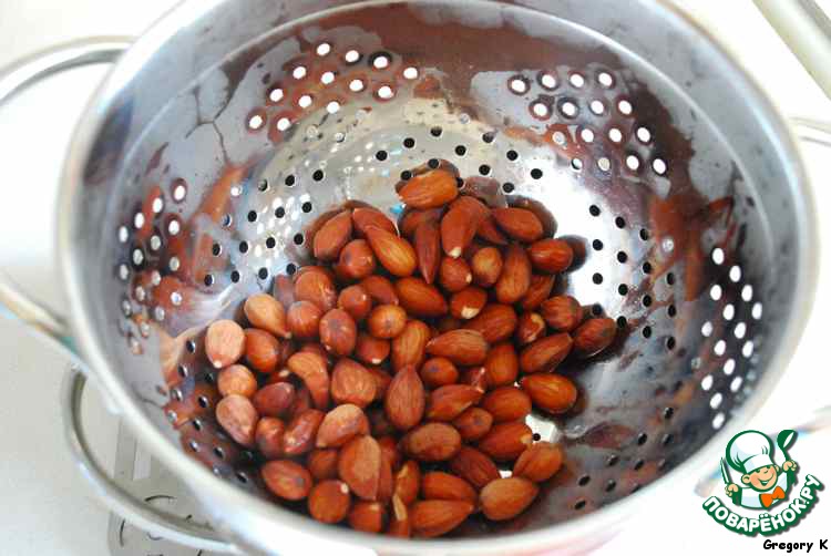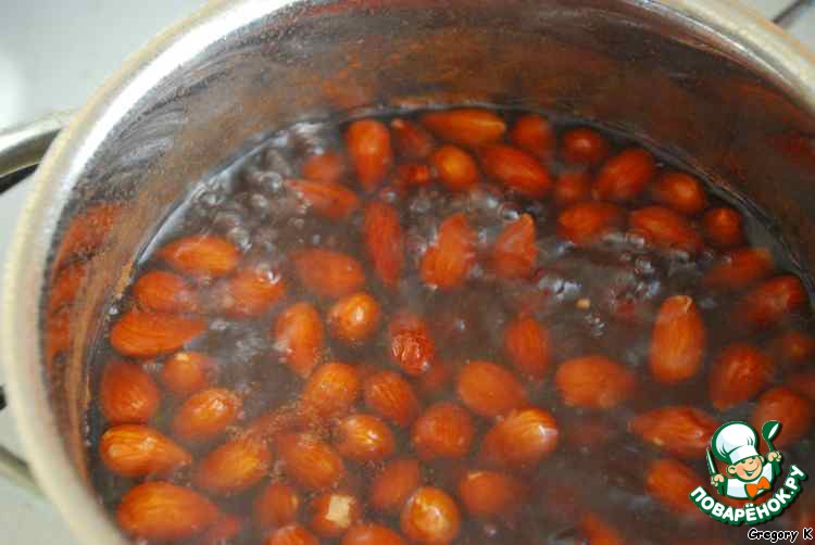 Очистить миндаль от шкурки. После варки она снимется очень легко, миндаль можно просто выдавливать из нее пальцами.