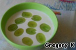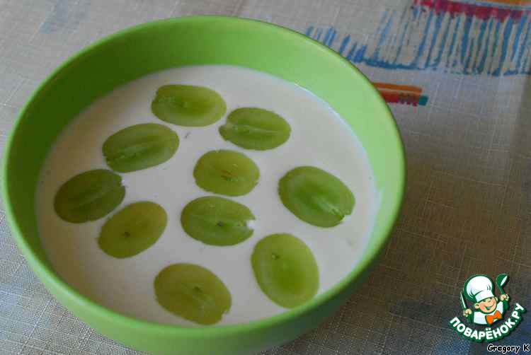 Потом разливаем по тарелкам и добавляем в них белый крупный виноград без косточек, разрезанный пополам.