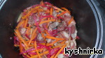 Затем добавить морковь, перец и свеклу, все перемешать и жарить еще 5 мин., пару раз помешав.