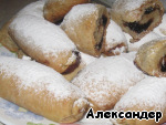 Достать из холодильника, раскатать тесто приблизительно 2-3 мм толщиной. Разделить тесто на квадраты. Смазать джемом и свернуть кифлики - трубочки. Хорошо залепить края, чтобы не вытек джем. Поставить в духовку минут на 30-35, температура 180-200 градусов.