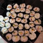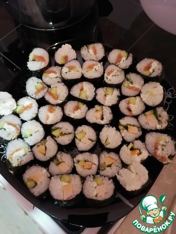 Имейте в виду, что далее рис должен быть использован в тёплом виде, поэтому ингредиенты для суши готовьте заранее.