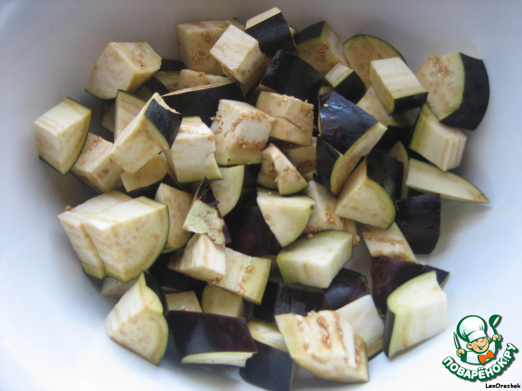 Все овощи тщательно моем. Баклажаны нарезаем большими кубиками и пересыпаем солью. Оставляем на 10-15 минут, после чего сливаем образовавшийся сок, таким образом удаляя горечь.