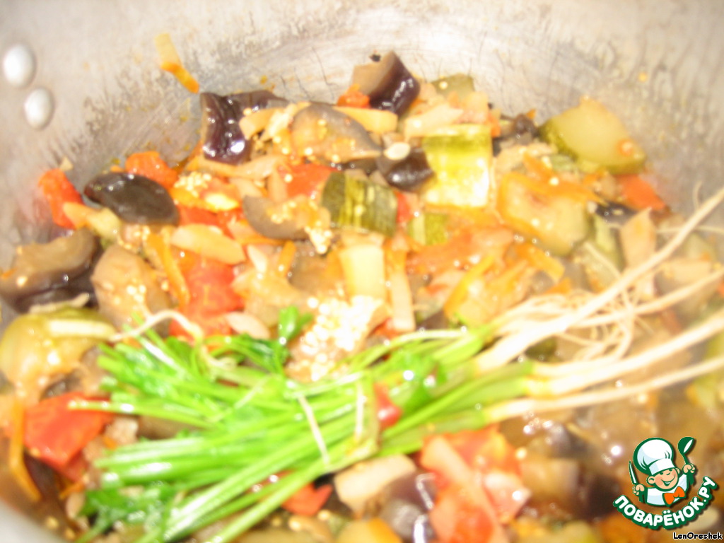 В кастрюлю с кабачками, баклажанами и репой кладем пассерованные овощи. У петрушки отрезаем зелень. Добавляем связанные в пучок стебли и корни петрушки в кастрюлю. Солим по вкусу. Доводим овощи под крышкой до готовности, после чего извлекаем пучок петрушки.