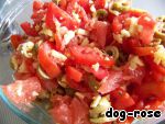 Заправка - оливковое масло, смешанное с солью и черным молотым перцем, можно добавить любые специи и приправы по вкусу, я положила приправу для салатов. Осторожнее с солью, оливки и сыр сами по себе соленые.