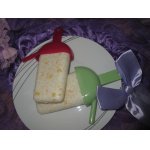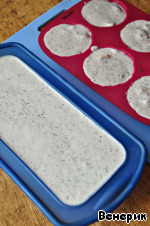 Я заливала в селиконовые формы (кстати, самый лучший вариант), не нужно выстилать пленкой, погружать в воду, из силиконовой формы всё замечательно и быстро выпрыгивает. -