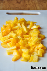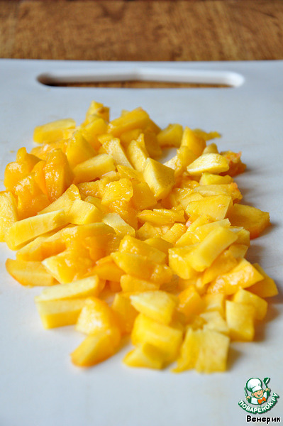 Мякоть мелко нарезать. (Консервированные персики откинуть на дуршлаг и нарезать). Малину перебрать.