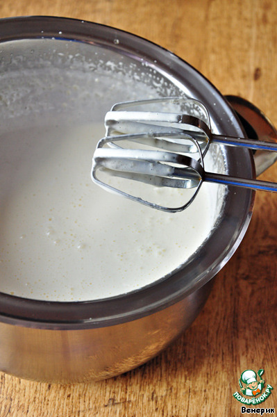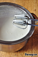 Снять миску с водяной бани, поместить в ёмкость с холодной водой и продолжать взбивать, пока масса не остынет. Сливки взбить