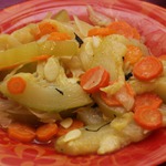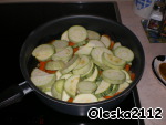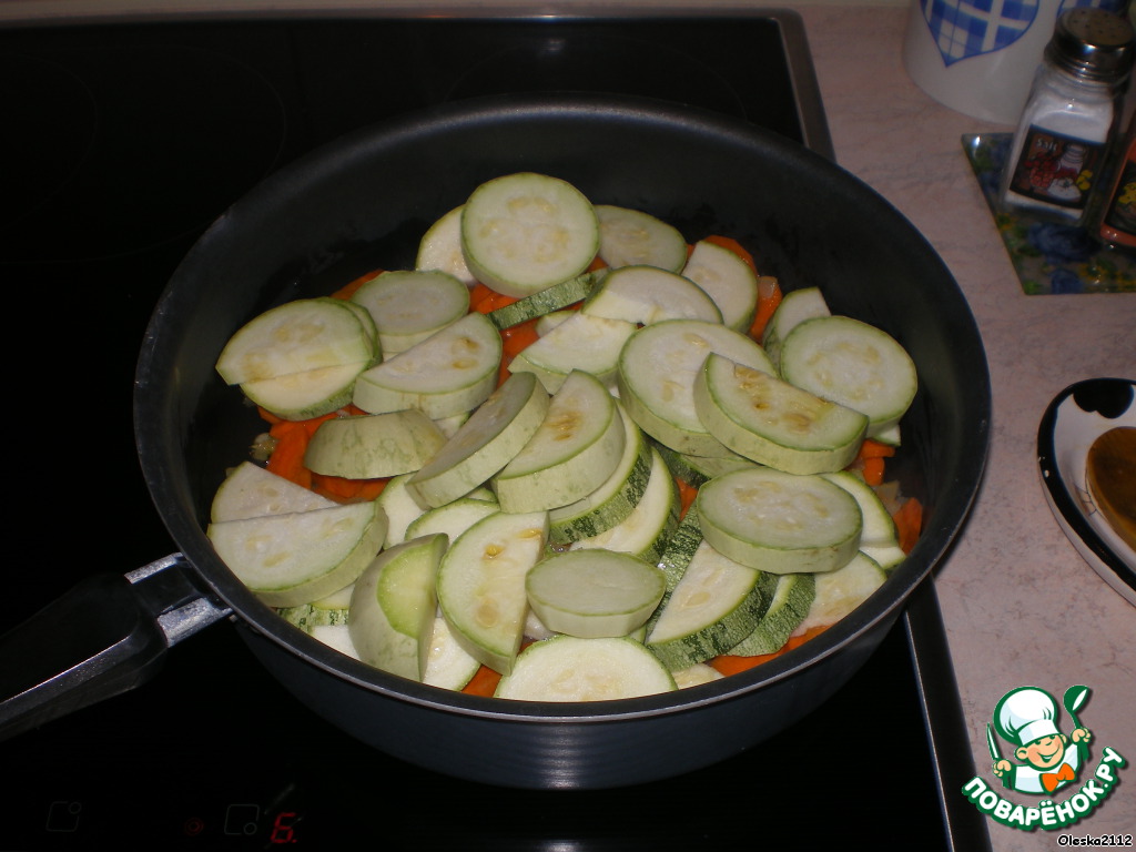 Морковь режем кружочками или половинками толщиной 0,5 см. Добавляем в сотейник и пассеруем вместе с луком, периодически помешивая. Тем временем режем кабачки и цуккини кружочками и половинками. Добавляем в сотейник.