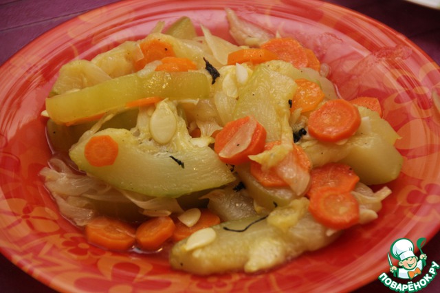Обжариваем около 5 минут. После чего вливаем воды немножко (100-120 мл), добавляем по вкусу сушёную мяту, измельченный чеснок, сахар, солим, перчим. Тушим минут 7, затем добавляем лимонный сок и готовим до мягкости овощей. Блюдо очень вкусное как в горячем, так и в холодном виде.