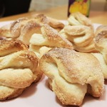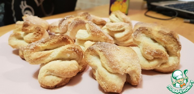 Раскатать тесто в пласт толщиной 3-4 мм. Формой или стаканом вырезать кружки. Каждый кружок одной стороной обмакнуть в сахар, затем сложить пополам сахаром внутрь, обмакнуть одну сторону еще в сахар, опять сложить пополам сахаром внутрь. Полученный треугольник обмакнуть еще раз в сахар и положить на противень сахаром вверх. Обмакивая в сахар, не забывайте пальцами чуть прижимать тесто. Так лучше налипнет сахар, и печенье не будет раскрываться при выпечке.