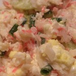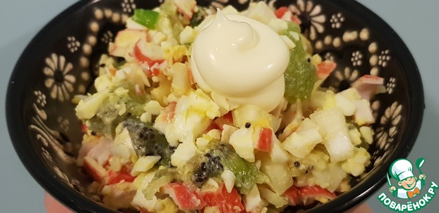Только я его слоями укладывала (на фото уже результат в тарелке): крабовые палочки на терку - майонез - яйца на терку- майонез - лук - киви кружочками.