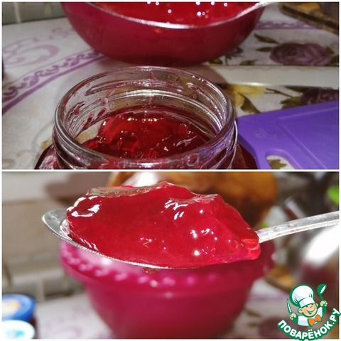 Разложить желе в горячем виде по сухим стерилизованным банкам. Остудить, укупорить банки крышками.