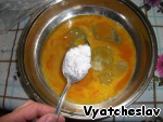 Взбиваем 5 яиц, гасим соду горячей водой и добавляем вместе с сахаром. Сюда же чайную ложку соли. Тщательно перемешиваем.