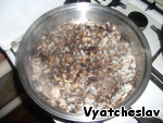 Параллельно шинкуем шампиньоны и отправляем их тушиться (я это делаю без масла) на среднем огне в большом сотейнике. Нарезаем мелкими кубиками лук и добавляем вместе с солью и смесью перцев, как только грибы пустят сок. И будем поджаривать ещё минут 10. После чего, не выключая огонь, выливаем сливки. Помешивая, достигаем загустения сливок и снимаем с плиты. Начинка готова.