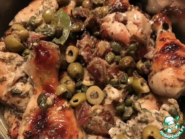 Рецепт из книги "The Silver Palate Cookbook". Курица, маринованная с маслом, винным уксусом, каперсами, маслинами, черносливом и травами, а затем запеченная с добавлением белого вина и коричневого сахара. Очень простой рецепт и отличный результат.
