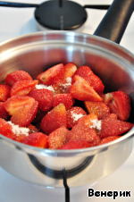 Теперь займёмся соусом. Клубнику разрезать на половинки или четыре части.