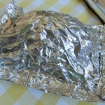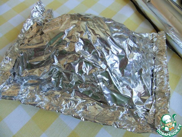 Далее и, пожалуй, самое главное - заворачиваем наш кусочек в ПЕРГАМЕНТ!!! Ни фольга, ни пакет, ни рукав, ни что угодно еще не дает именно такого вкуса, так что только пергамент - проверено. Пергамента не жалеем, с каждым слоем подворачиваем и края.