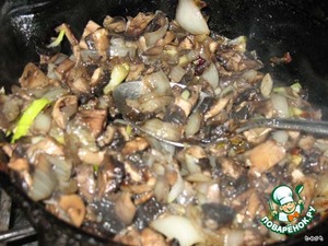 Обжариваем нашинкованный кольцами лук, потом добавляем грибы. И тушим минут 5-7.