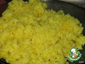 Варим рис с добавлением куркумы. Именно она придает рису такой золотистый цвет.