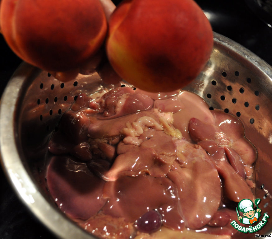 Хорошенько помоем куриную печень и персики.