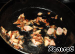 Бекон мелко нарежем и обжарим до шкварок.